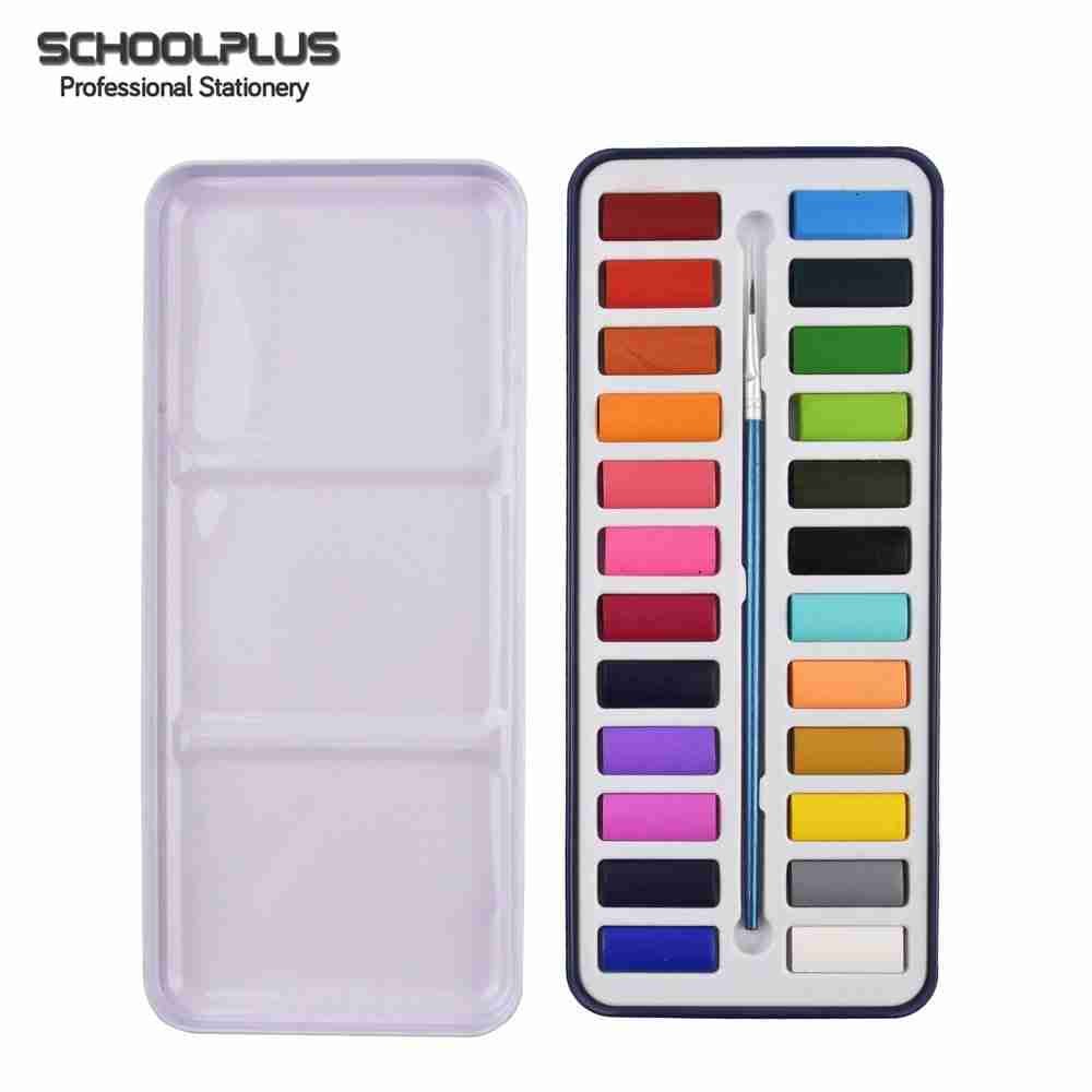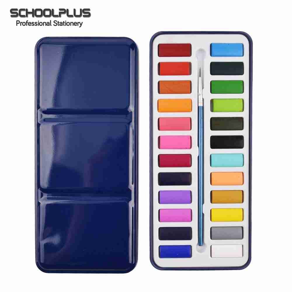 24 colors tin box portable travel pigment solid watercolor paint set with pen