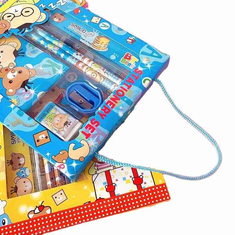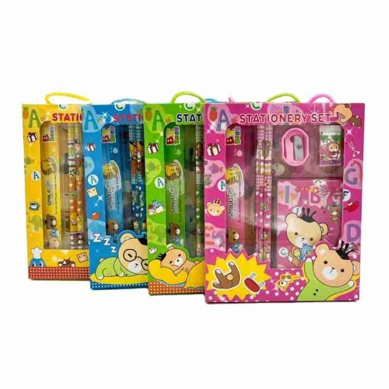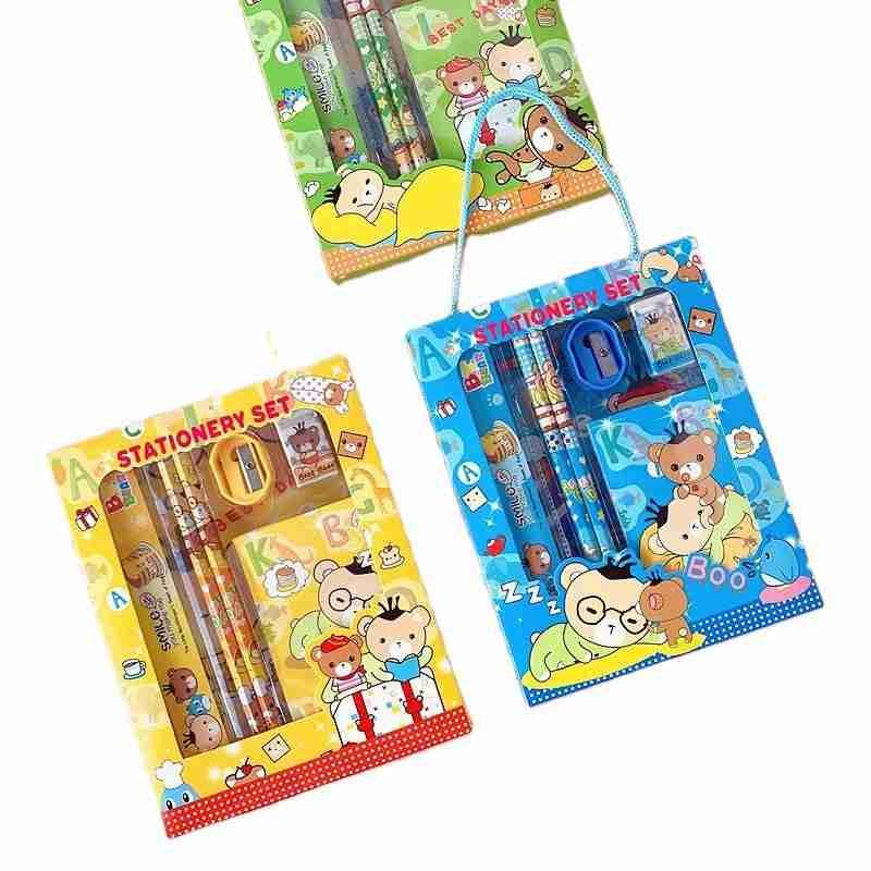 Set Included:Pencil x 2, Ruler x 1, Notebook x1, Eraser x 1, Sharpener x 1