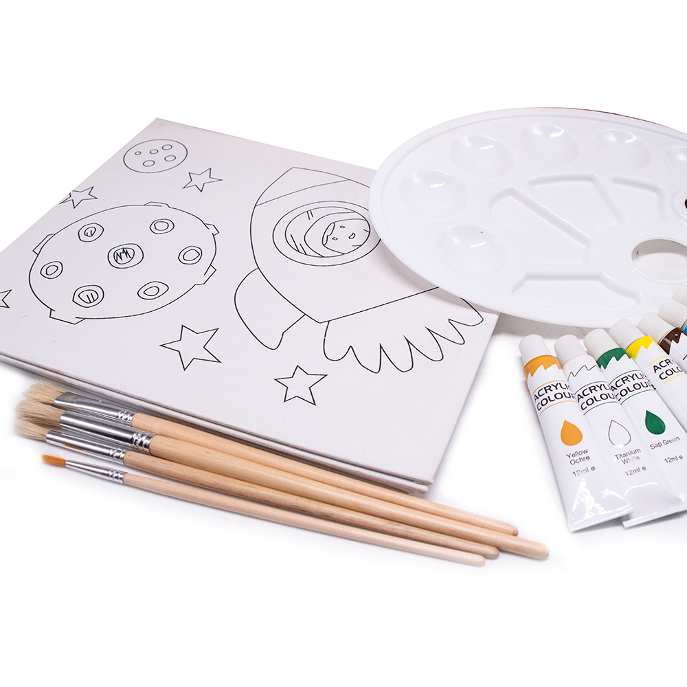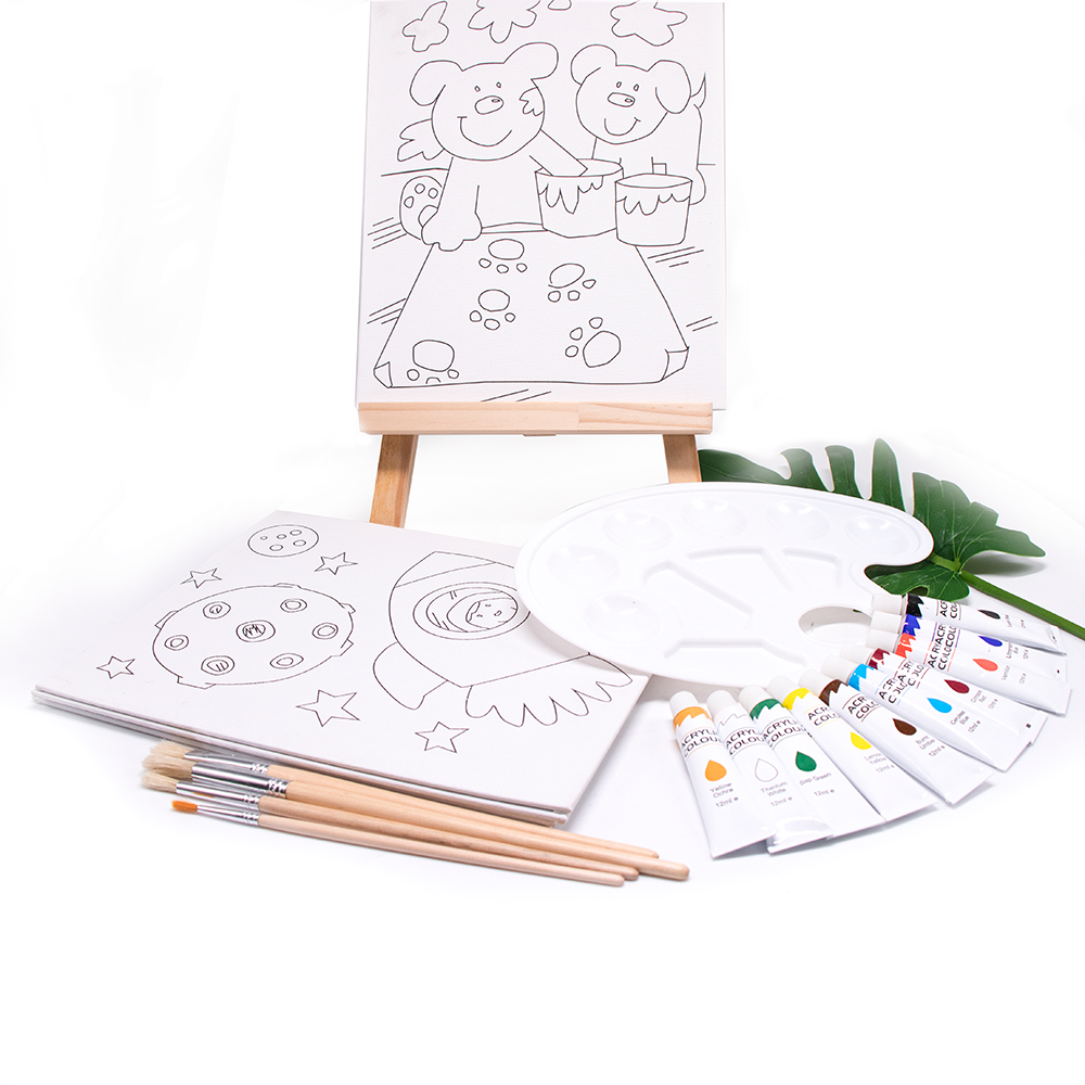 Content:mini easel/acrylic paint/painting brush/pre-printed canvas